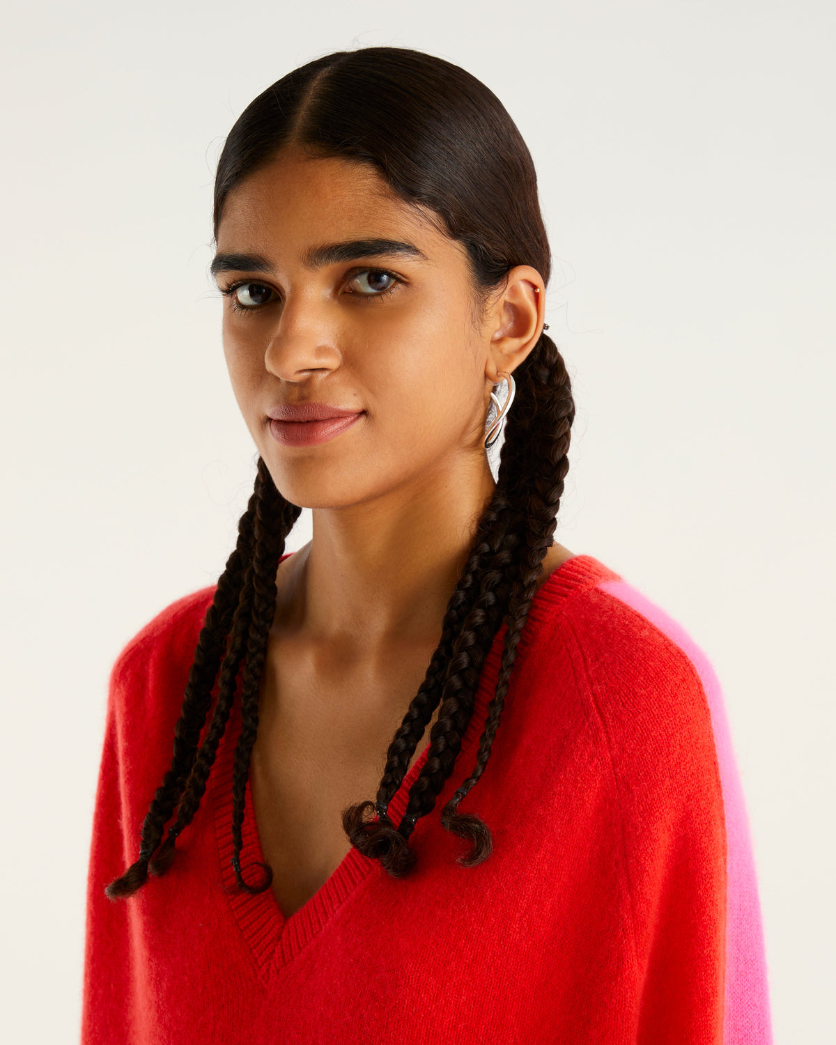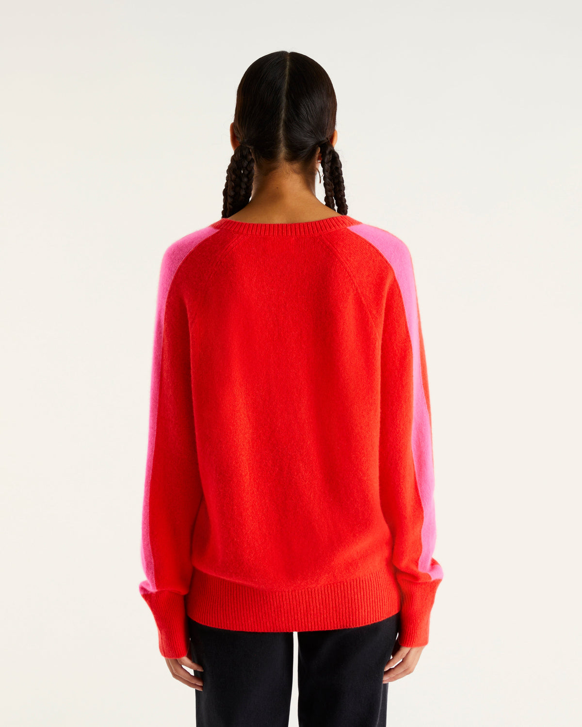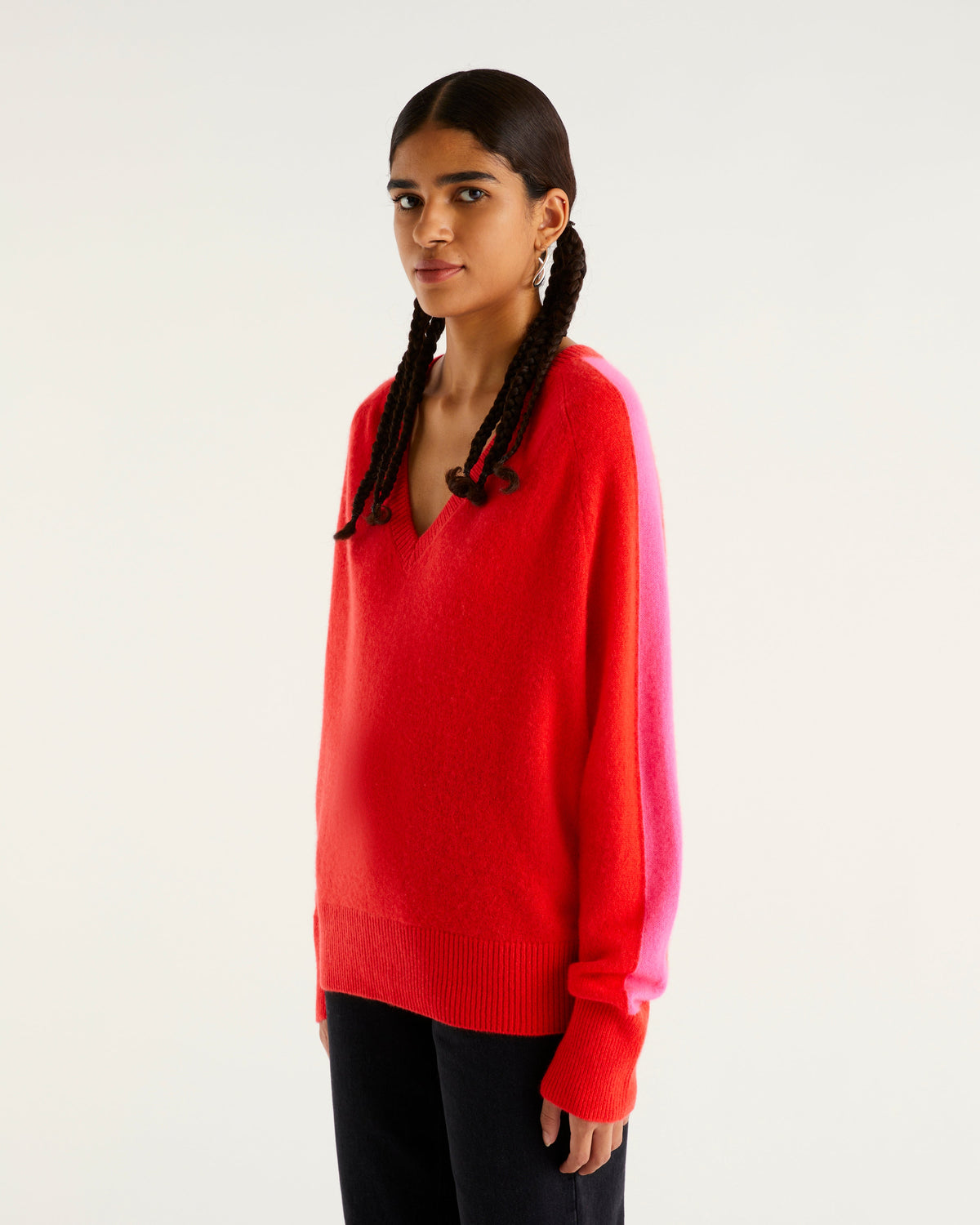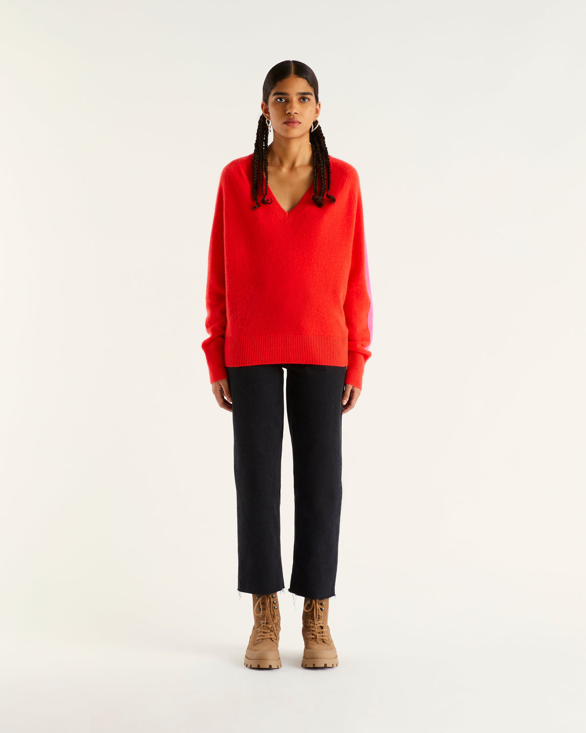Sweater Col V Oversize Bande Manche 2 Fils - 100% Cachemire - Rouge Vif