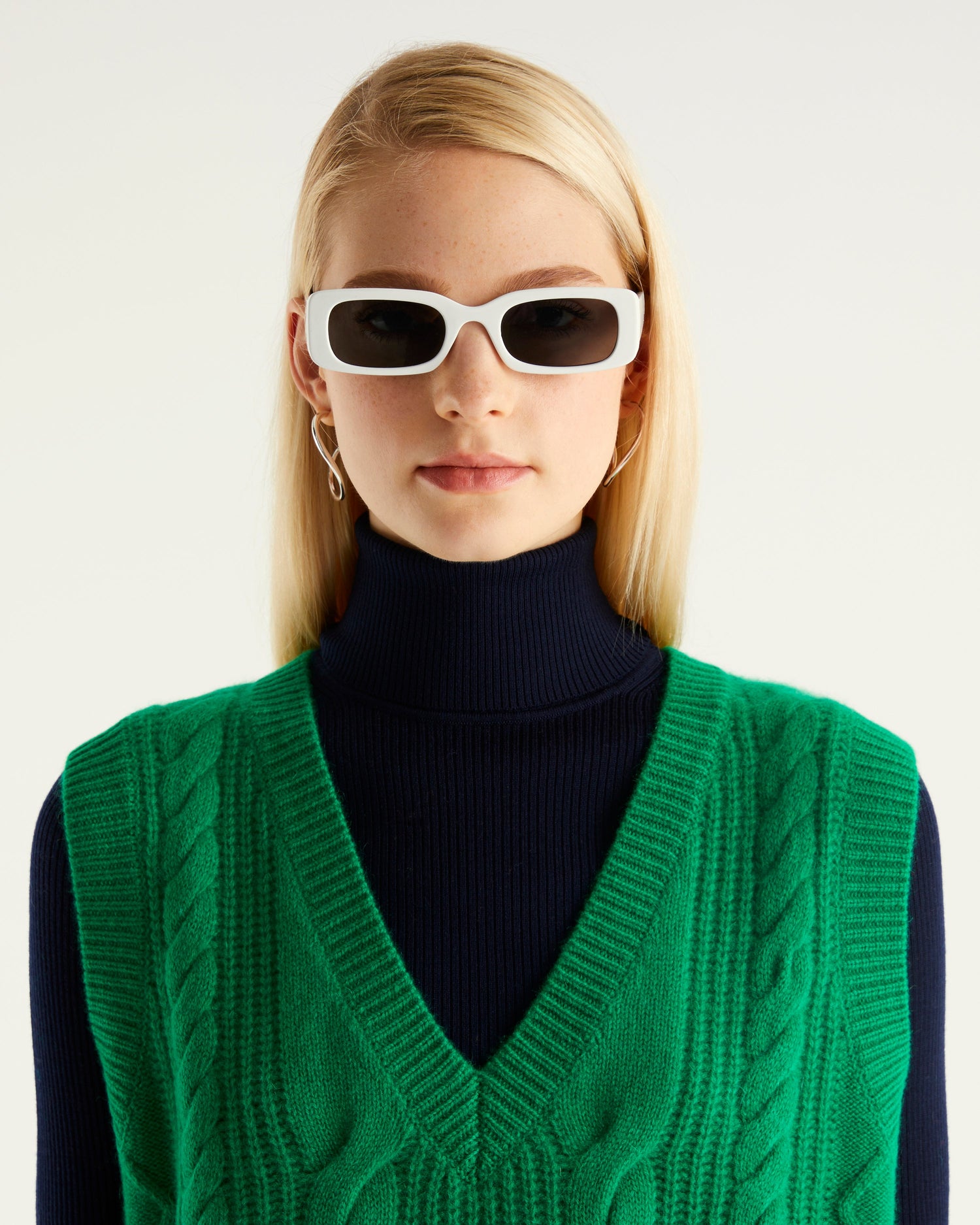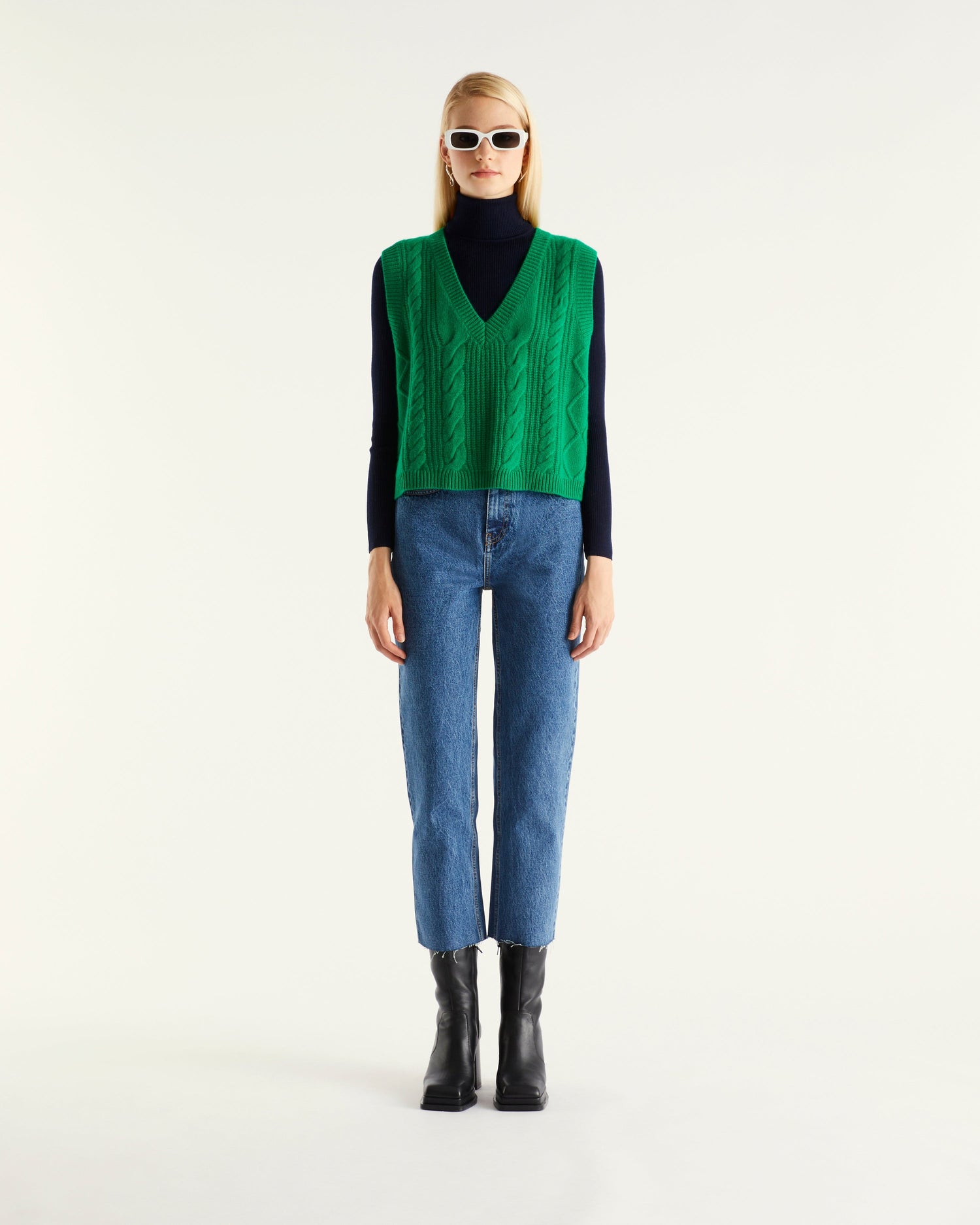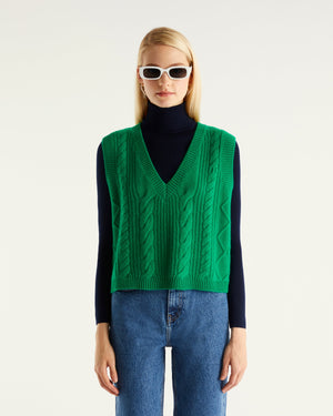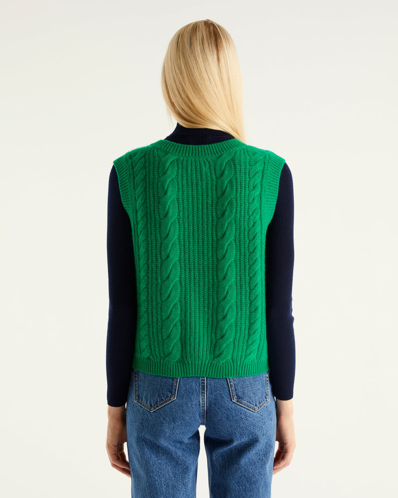 Sweater Col V Court Sans Manche À Torsades 6 Fils - 100% Cachemire - Vert Gazon