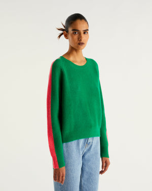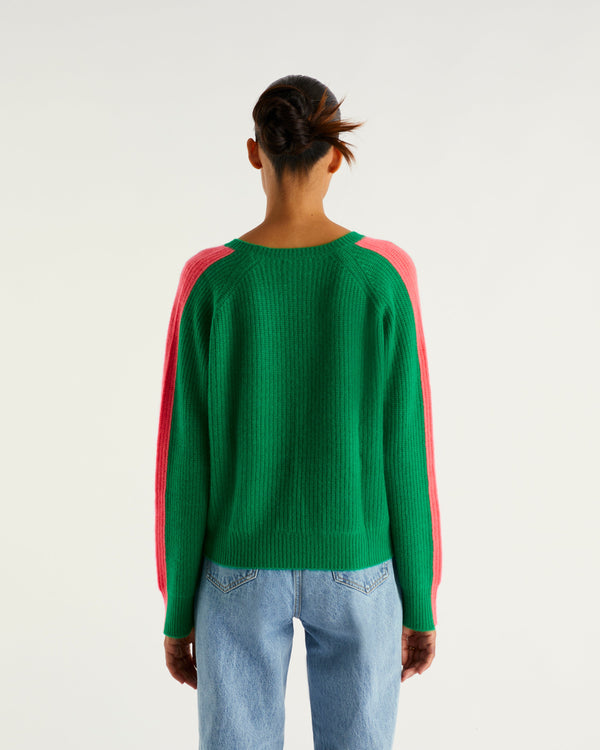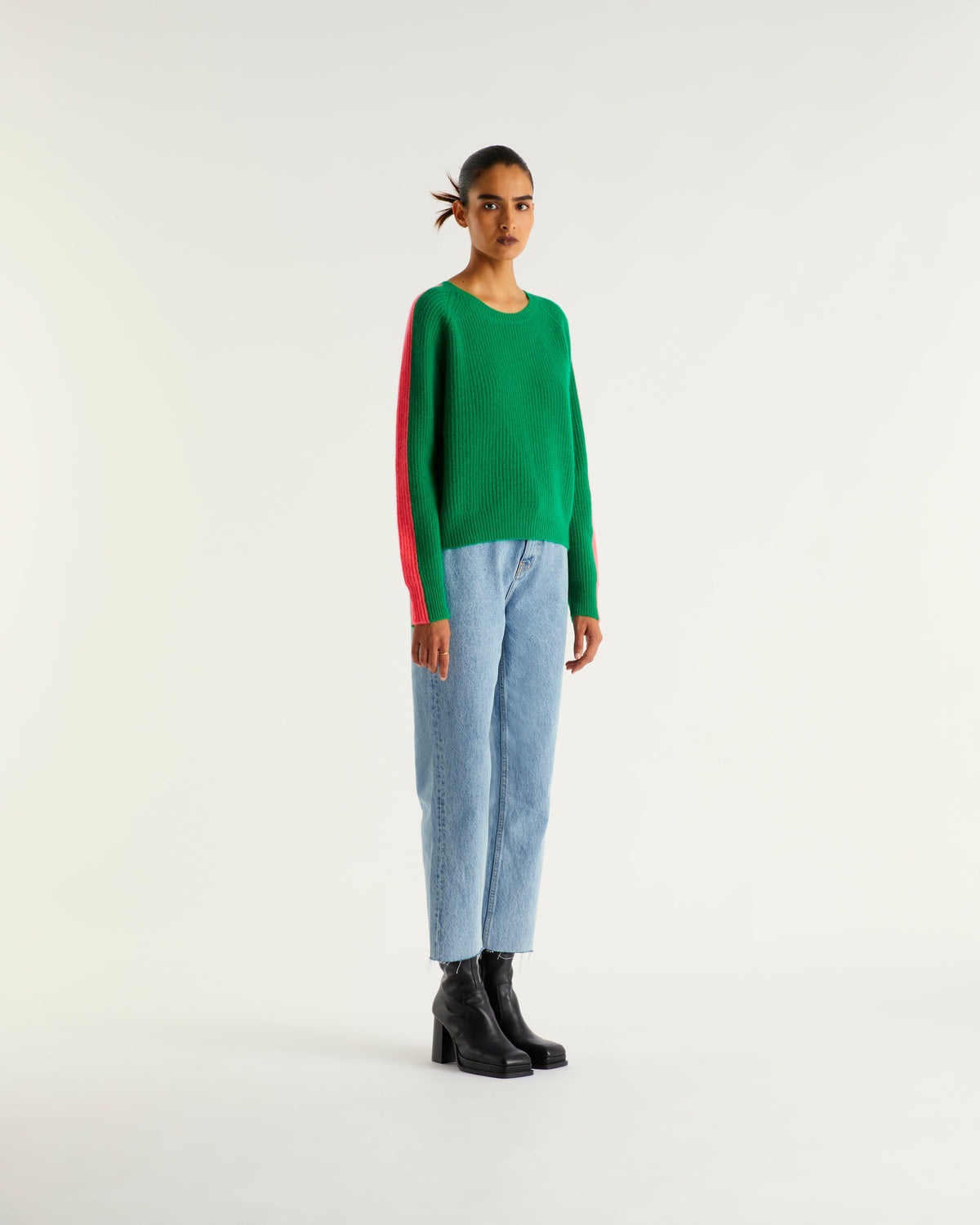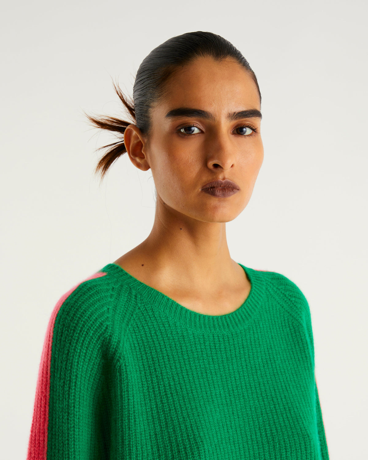 Sweater Col Rond Court Maille Perlée À Bande 4 Fils - 100% Cachemire - Vert Gazon