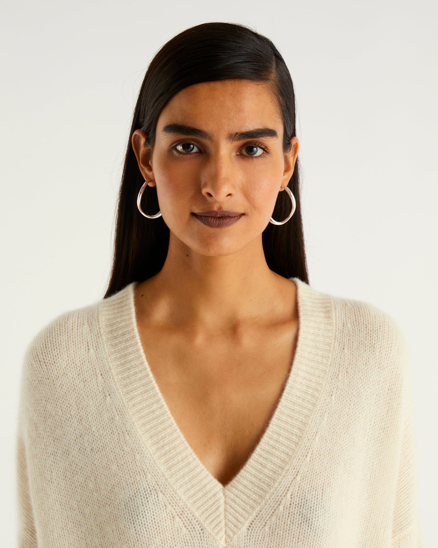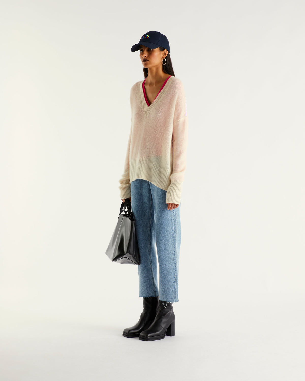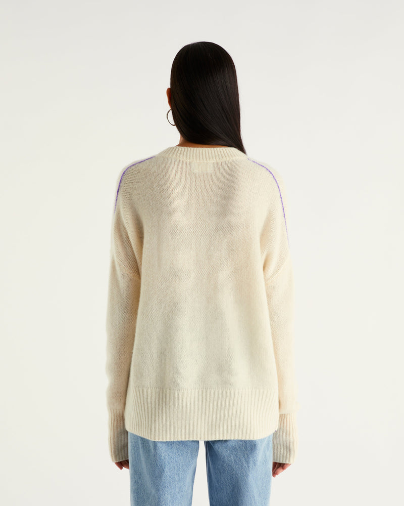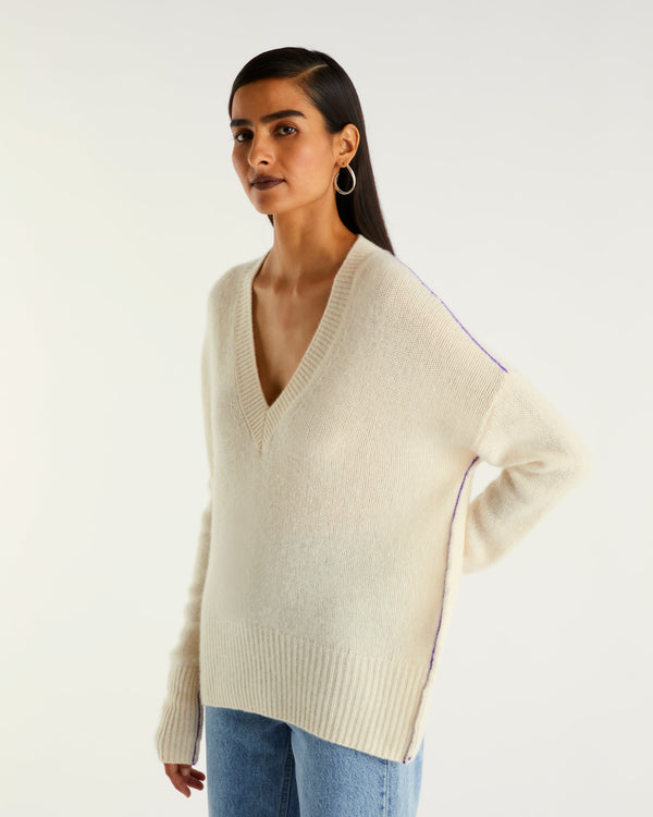 Sweater Col V Court Oversize Linking Contrastés 6 Fils - 100% Cachemire - Écru