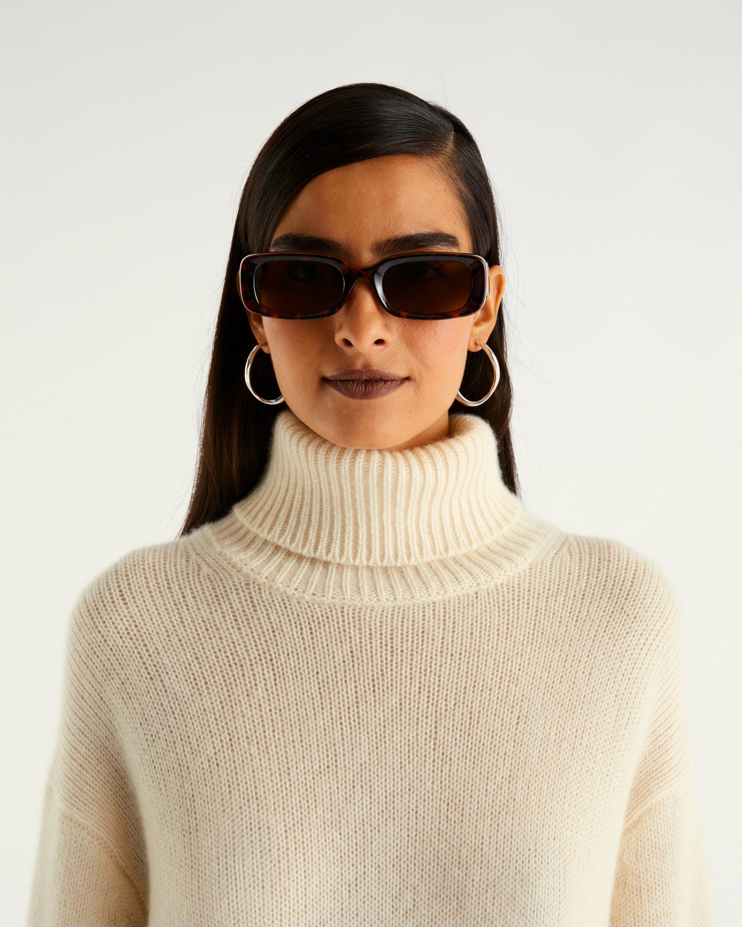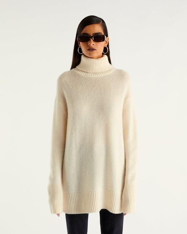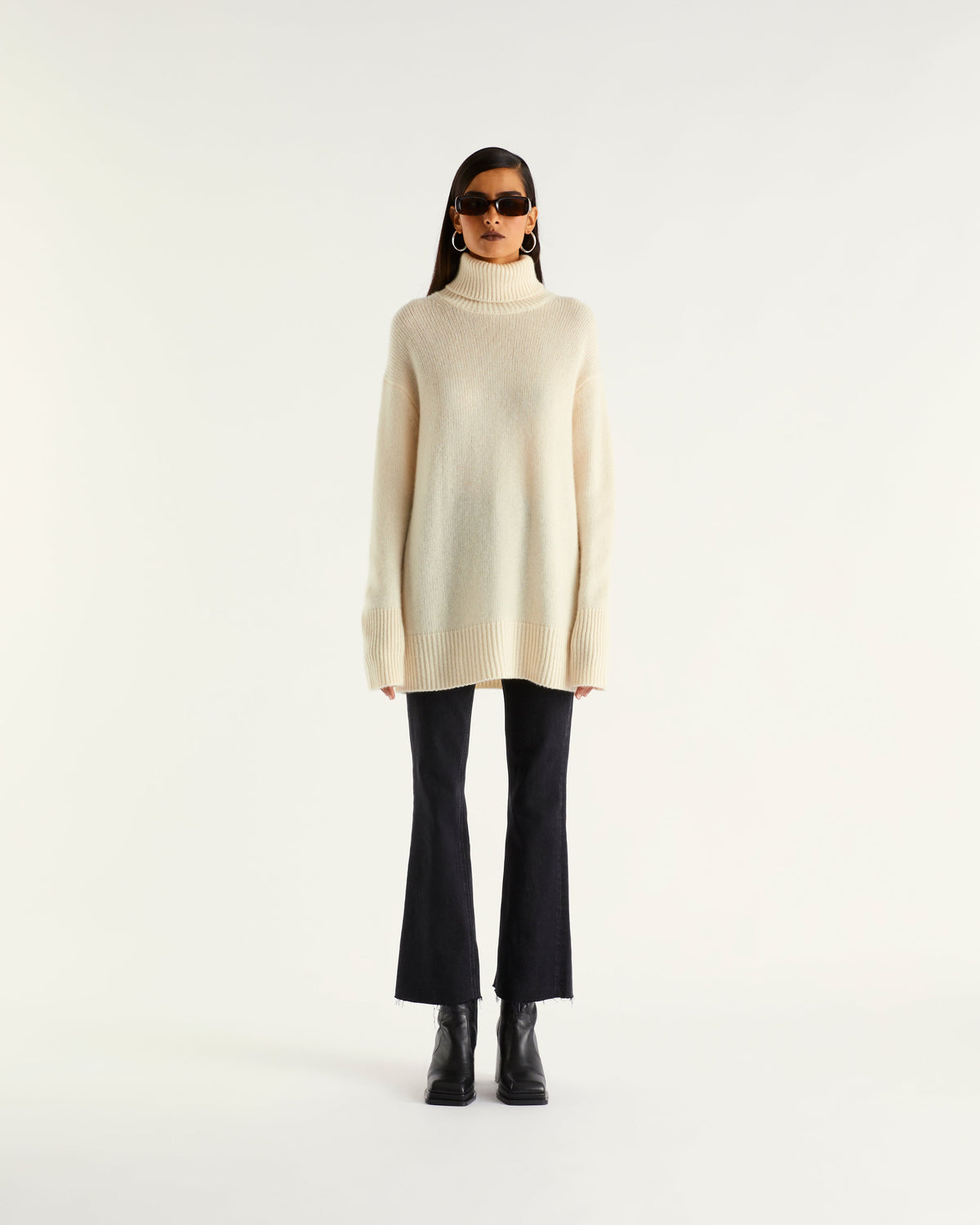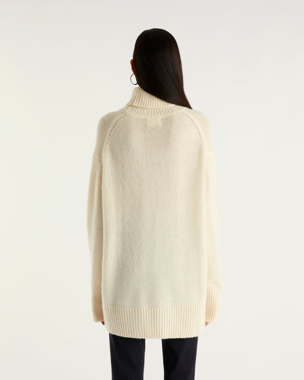Sweater Col Roulé Oversize Long 6 Fils - 100% Cachemire - Écru