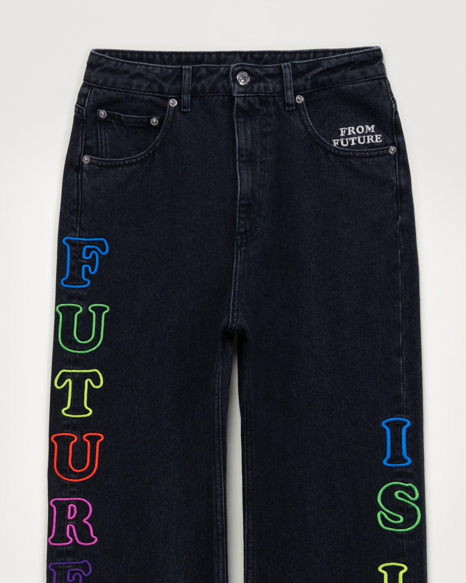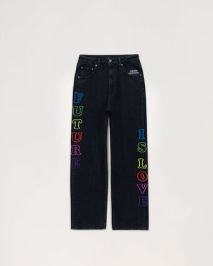 Un jean loose, sans doute le plus cool des flares en ville. Délavages colorés en signature. Détail brodé "Future Is Love" . 5 poches. Fermeture par bouton siglé. Jacron sur l'arrière. Osez la couleur de la tête au pied.
