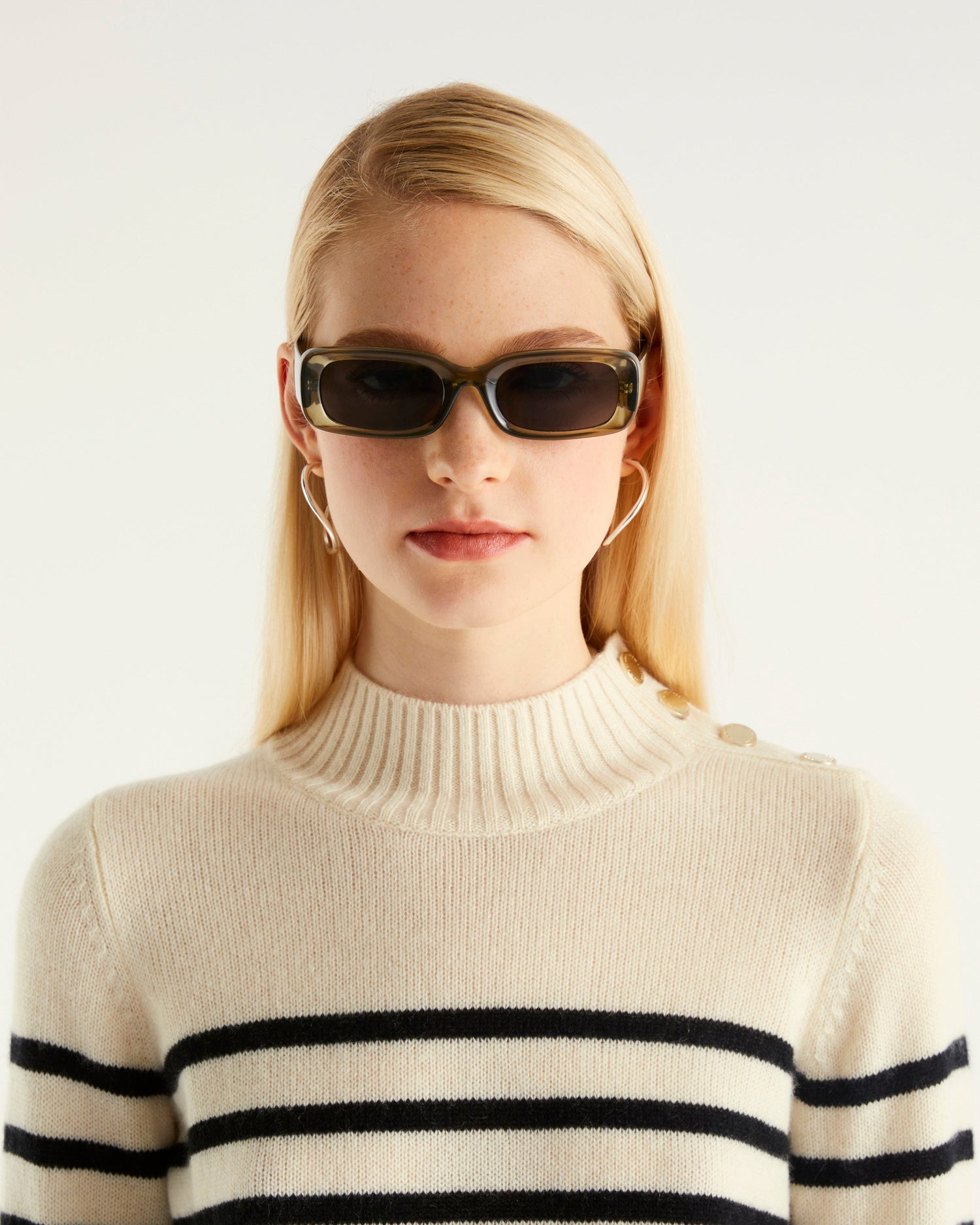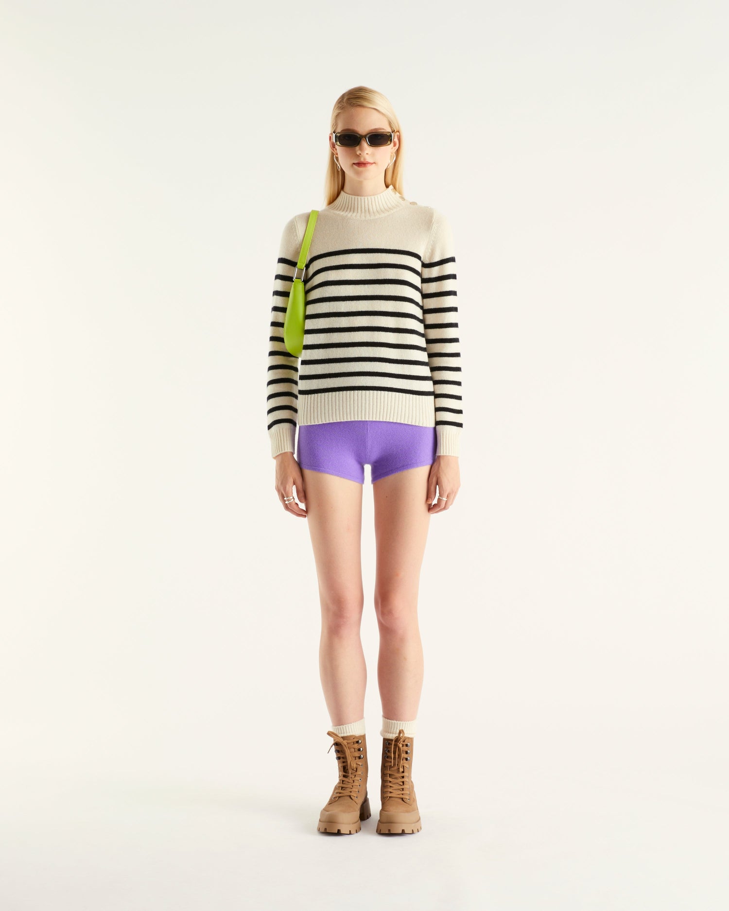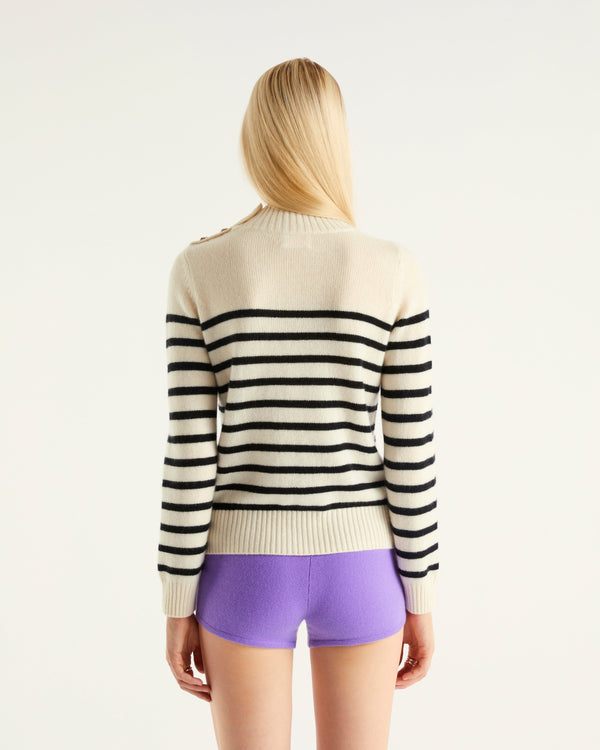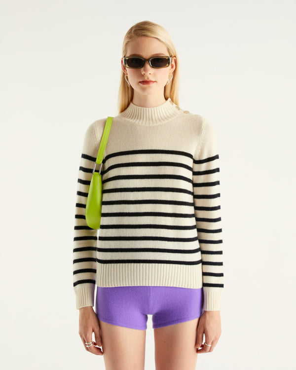 Sweater Marinière Col Montant À Bouton 4 Fils - 100% Cachemire - Écru